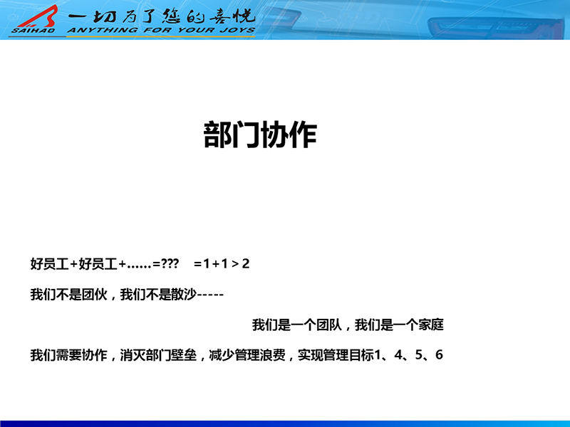 會議最后,公司董事長虞總進(jìn)行了總結(jié):每個人都是賽豪大家庭的一員,管理人員遇到問題要換位思考,站在不同的角度去思考去探討。同時我們需要有全局意識,我們是個團(tuán)隊,要共同攜手打造賽豪“家”的文化。